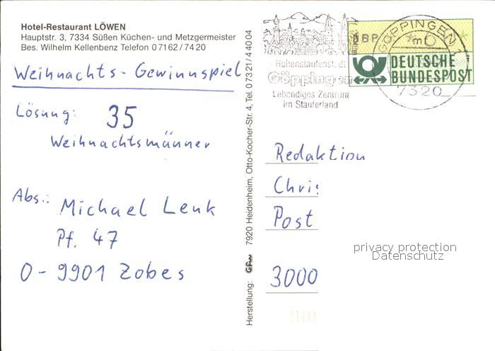72465671 alte Postkarte Suessen Hotel Restaurant Loewen Festtafel Speisesaal Gewoelbekeller postalisch gelaufen Erhaltung siehe scans KatCode: 11110008117049