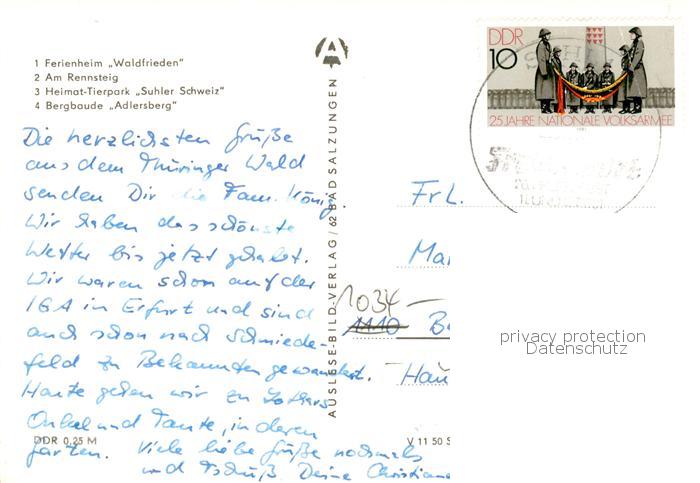 73865854 alte Postkarte Suhl Thueringer Wald Ferienheim Waldfrieden Am Rennteig Heimat Tierpark Suhler Schweiz Bergbaude Adlersberg postalisch gelaufen Erhaltung siehe scans [WerneD78] KatCode: 11110016054000