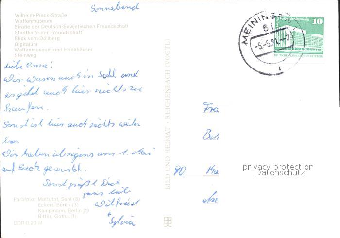 72315064 alte Postkarte Suhl Thueringer Wald Hochhaus Waffenmuseu Strasse der DSF Stadthalle Doellbergblick Digitaluhr Fontaene Steinweg postalisch gelaufen Erhaltung siehe scans KatCode: 11110016054000