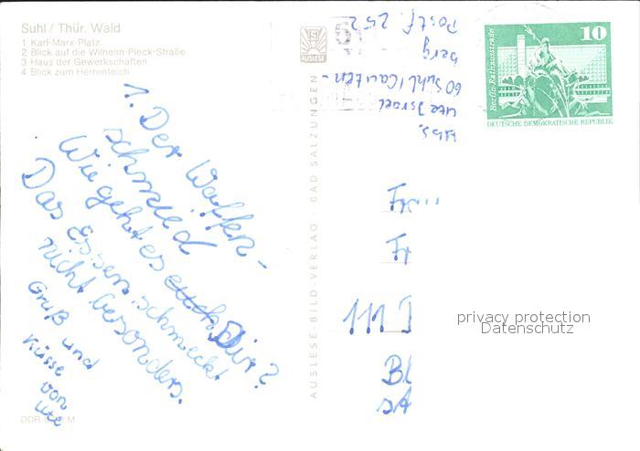 72374602 alte Postkarte Suhl Thueringer Wald Karl Marx Platz Wilhelm Pieck Strasse Haus der Gewerkschaften postalisch gelaufen Erhaltung siehe scans KatCode: 11110016054000
