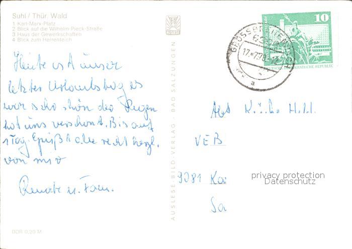 72372735 alte Postkarte Suhl Thueringer Wald Karl Marx Platz Wilhelm Pieck Strasse Herrenteich postalisch gelaufen Erhaltung siehe scans KatCode: 11110016054000
