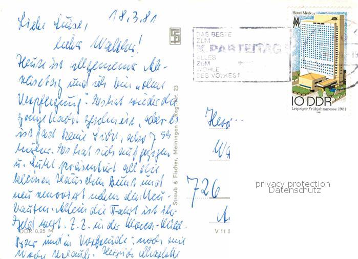 72728633 alte Postkarte Suhl Thueringer Wald Stadthalle der Freundschaft C Warenhaus Karl Marx Platz Steinweg Brunnen Wilhelm Pieck Strasse Hochhaeuser postalisch gelaufen Erhaltung siehe scans [FriedD77] KatCode: 11110016054000