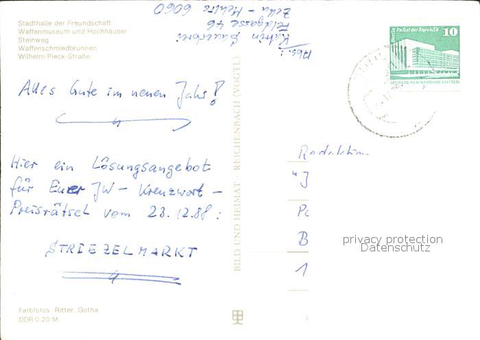 72135880 alte Postkarte Suhl Thueringer Wald Stadthalle Waffenmuseum Hochhaeuser Steinweg Waffenschmiedbrunnen Wilhelm Pieck Strasse Wappen postalisch gelaufen Erhaltung siehe scans KatCode: 11110016054000