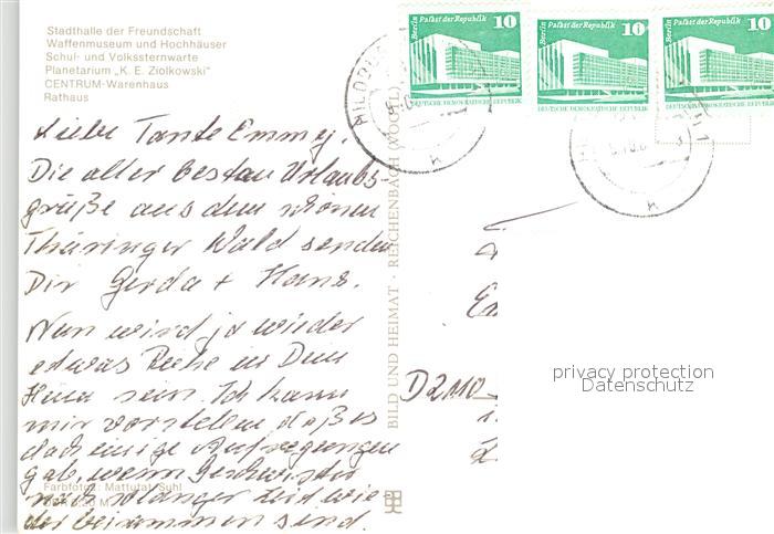 73076072 alte Postkarte Suhl Thueringer Wald Stadthalle Waffenmuseum Rathaus Centrum Warenhaus postalisch gelaufen Erhaltung siehe scans [KathaD81] KatCode: 11110016054000