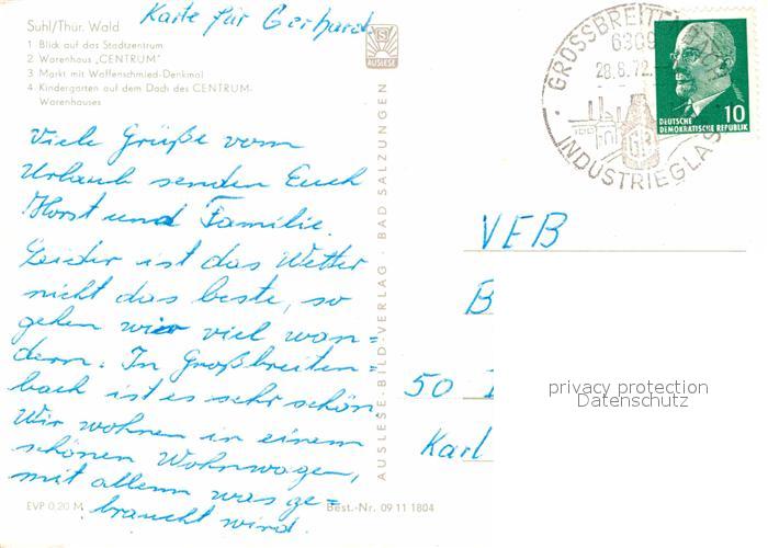 72742982 alte Postkarte Suhl Thueringer Wald Stadtzentrum Markt mit Waffenschmied-Denkmal Kindergarten postalisch gelaufen Erhaltung siehe scans [LiesaD40] KatCode: 11110016054000