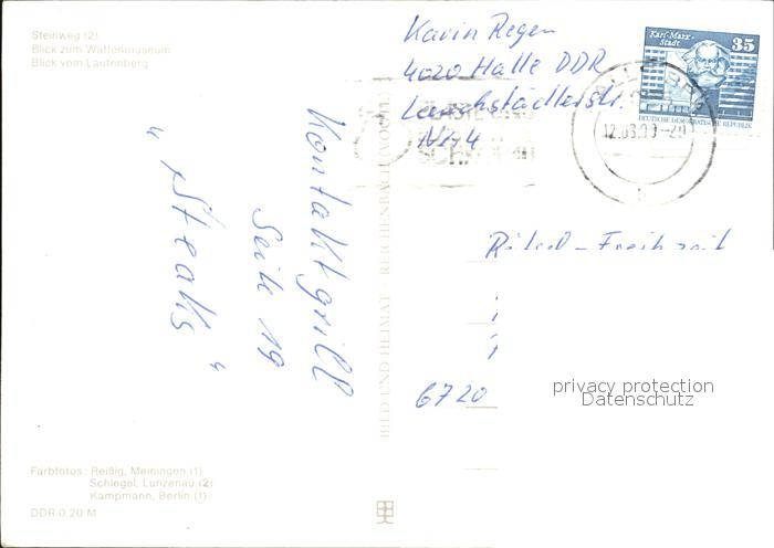72413596 alte Postkarte Suhl Thueringer Wald Steinweg Blick zum Waffenmuseum Blick vom Lauterberg postalisch gelaufen Erhaltung siehe scans KatCode: 11110016054000