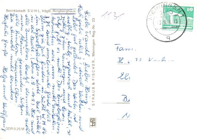 73900999 alte Postkarte Suhl Thueringer Wald VdgB Ringberghaus postalisch gelaufen Erhaltung siehe scans [WerneD78] KatCode: 11110016054000
