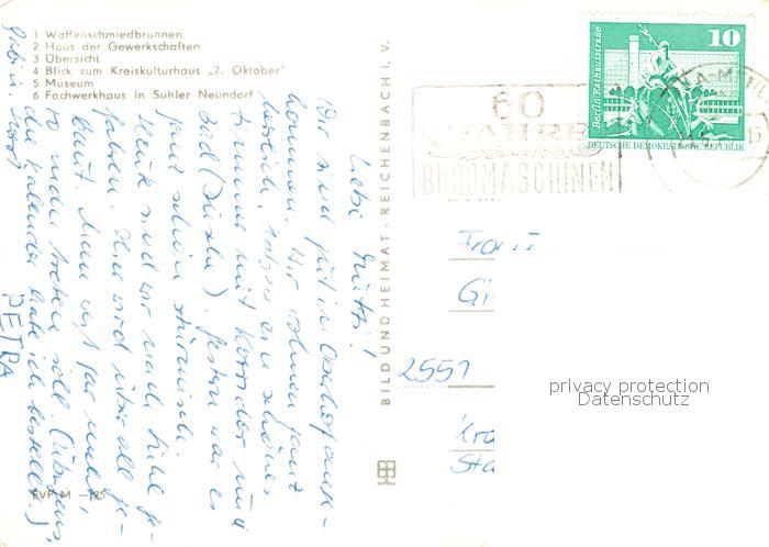 73865880 alte Postkarte Suhl Thueringer Wald Waffenschmiedbrunnen Haus der Gewerkschaften uebersicht Kreiskulturhaus 7. Oktober Museum Fachwerkhaus postalisch gelaufen Erhaltung siehe scans [FriedD77] KatCode: 11110016054000