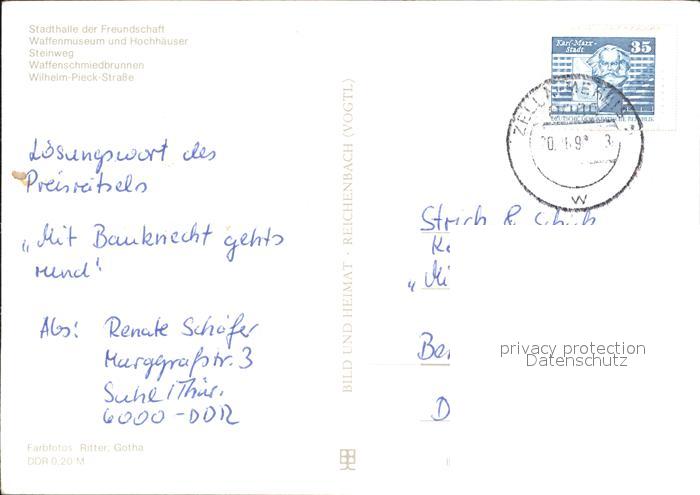 72050924 alte Postkarte Suhl Thueringer Wald Waffenschmiedbrunnen Waffenmuseum Hochhaeuser Stadthalle der Freundschaft postalisch gelaufen Erhaltung siehe scans KatCode: 11110016054000