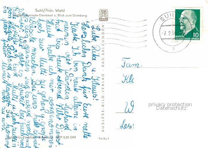 72616299 alte Postkarte Suhl Thueringer Wald Waffenschmiede Denkmal Blick zum Domberg postalisch gelaufen Erhaltung siehe scans [FriedD77] KatCode: 11110016054000