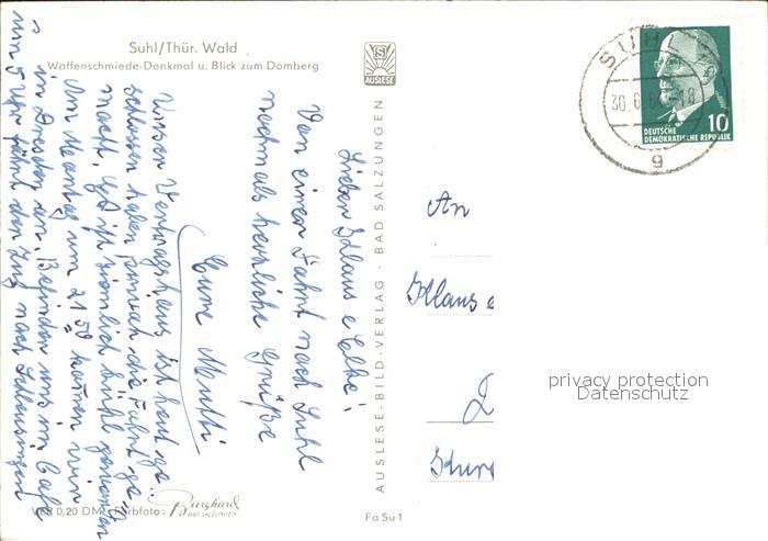 72001960 alte Postkarte Suhl Thueringer Wald Waffenschmiede Denkmal Domberg postalisch gelaufen KatCode: 11110016054000
