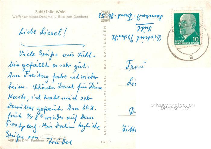 73103244 alte Postkarte Suhl Thueringer Wald Waffenschmiede Denkmal mit Dombergblick postalisch gelaufen Erhaltung siehe scans [WerneD78] KatCode: 11110016054000