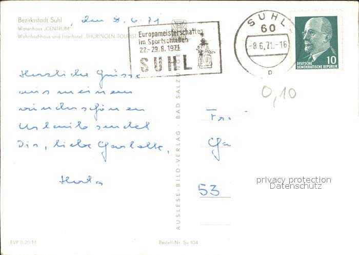 72249235 alte Postkarte Suhl Thueringer Wald Warenhaus Centrum Wohnhochhaus Interhotel Thueringen Tourist postalisch gelaufen Erhaltung siehe scans KatCode: 11110016054000