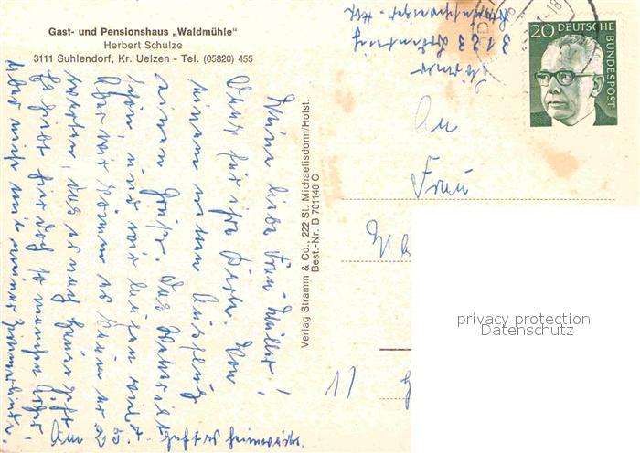 72915674 alte Postkarte Suhlendorf Gast Pensionshaus Waldmuehle postalisch gelaufen Erhaltung siehe scans [KathaD81] KatCode: 11110003360024