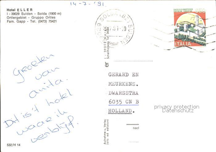old postcard Sulden Solda Hotel Eller postalisch gelaufen Erhaltung siehe scans