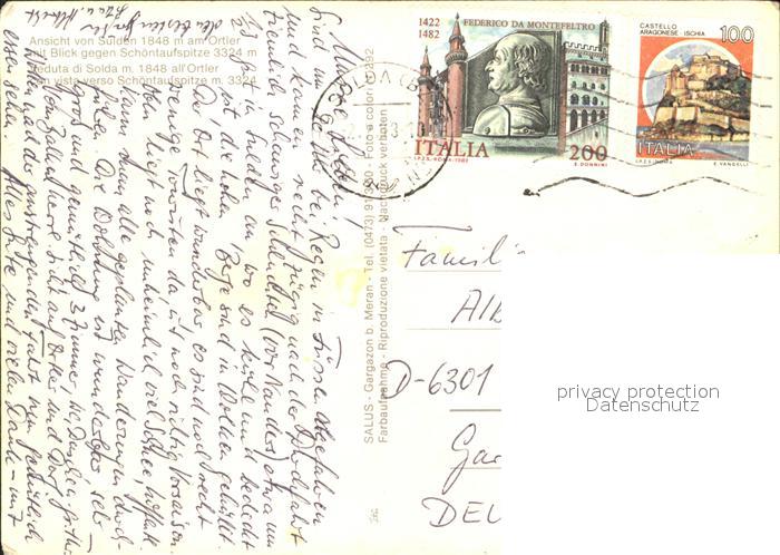 old postcard Sulden Solda mit Blick zur Schoentauspitze postalisch gelaufen Erhaltung siehe scans