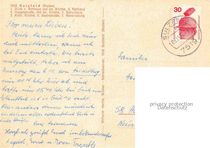 74020431 alte Postkarte Sulzfeld Baden Kirche Rathaus Hauptstrasse Schulhaus Bachstrasse Ravensburg postalisch gelaufen Erhaltung siehe scans [FriedD77] KatCode: 11110008215082