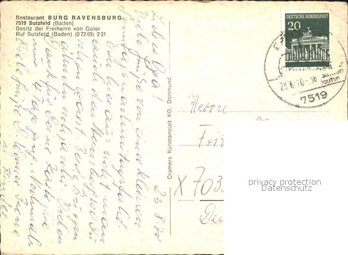 72567416 alte Postkarte Sulzfeld Baden Restaurant Burg Ravensburg postalisch gelaufen Erhaltung siehe scans [LiesaD40] KatCode: 11110008215082