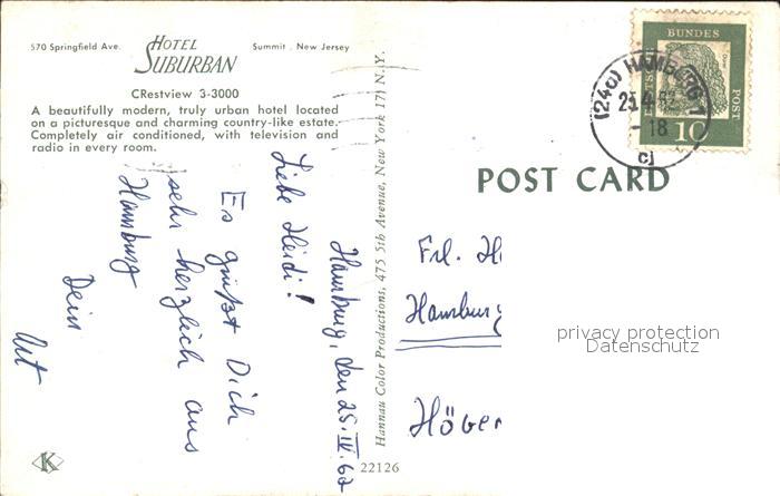 72132683 old postcard Summit New Jersey Hotel Suburban postalisch gelaufen Erhaltung siehe scans KatCode: 14140320000000