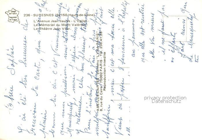 13219449 Suresnes Avenue Jean Jaurès Eglise Memorial du Mont Valerien Theatre Jean Vilar postalisch nicht gelaufen Erhaltung siehe scans [FriedD77] KatCode: 11170092292073