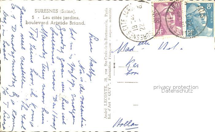 12306785 carte postale Suresnes Cites Jardins boulevard Aristide Briand postalisch gelaufen Erhaltung siehe scans KatCode: 11170092292073