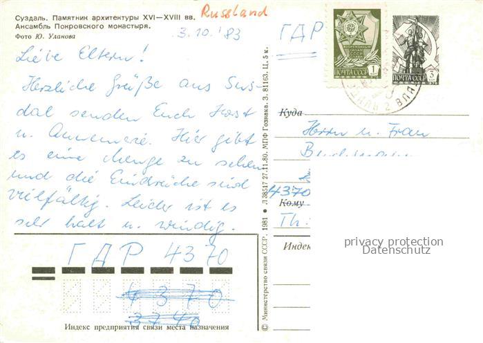 74042081 old postcard Susdal Frauen Kloster Ansambel Pokrovskoho postalisch gelaufen Erhaltung siehe scans [IrynaD87] KatCode: 11440