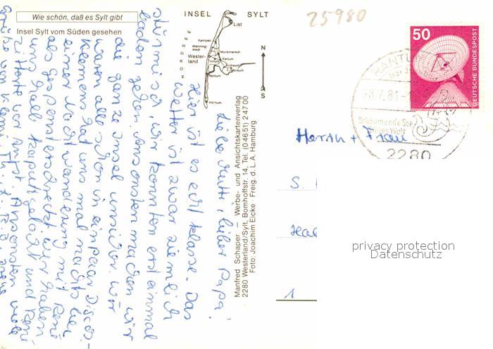 72872723 alte Postkarte Sylt Fliegeraufnahme von Sueden postalisch gelaufen Erhaltung siehe scans [LiesaD40] KatCode: 11110001054133