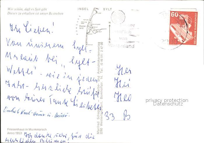 72307464 alte Postkarte SYLT Insel Schleswig-Holstein Friesenhaus Munkmarsch postalisch gelaufen Erhaltung siehe scans KatCode: 11110001054133