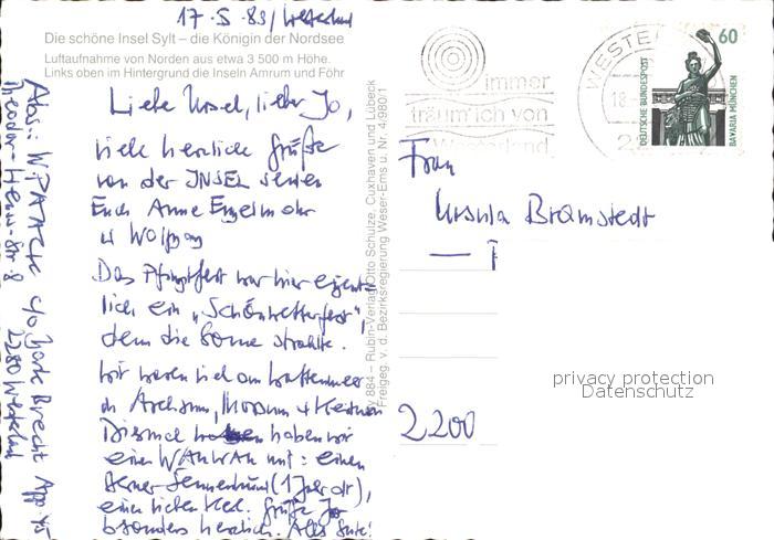 72051973 alte Postkarte SYLT Insel Schleswig-Holstein Luftaufnahme von NordenLinks oben im Hintergrund die Inseln Armrum,Foehr postalisch gelaufen Erhaltung siehe scans KatCode: 11110001054133