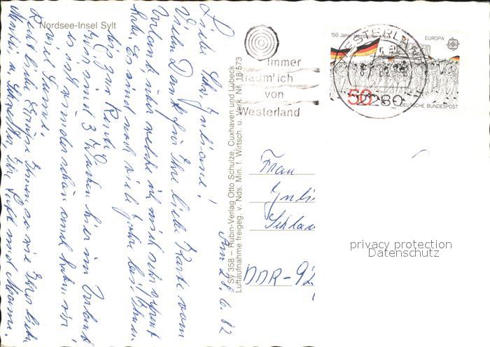 72423541 alte Postkarte SYLT Insel Schleswig-Holstein Westerland Keitum Wenningstedt List Munkmarsch Kampen Hoernum Fliegeraufnahme postalisch gelaufen Erhaltung siehe scans KatCode: 11110001054133