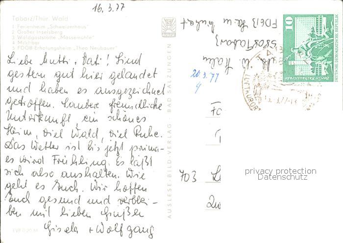72421983 alte Postkarte Tabarz Ferienheim Schweizerhaus Grosser Inselsberg Waldgaststaette Massemuehle Milchbar FDGB Erholungsheim postalisch gelaufen Erhaltung siehe scans KatCode: 11110016067064