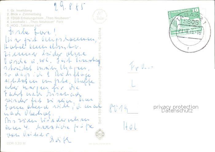 72352742 alte Postkarte Tabarz Gr Inselsberg Blick vom Zimmerberg FDGB Erholungsheim Theo Neubauer Lesehalle HOG Tabarzer Hof postalisch gelaufen Erhaltung siehe scans KatCode: 11110016067064