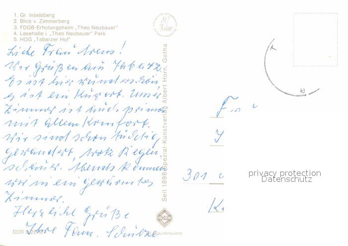 72616382 alte Postkarte Tabarz Grosser Inselsberg Zimmerberg FDGB Erholungsheim Lesehalle HO Gaststaette postalisch gelaufen Erhaltung siehe scans [FriedD77] KatCode: 11110016067064