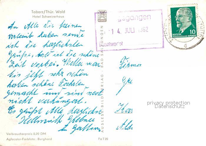 72654407 alte Postkarte Tabarz Hotel Schweizerhaus postalisch gelaufen Erhaltung siehe scans [WerneD78] KatCode: 11110016067064