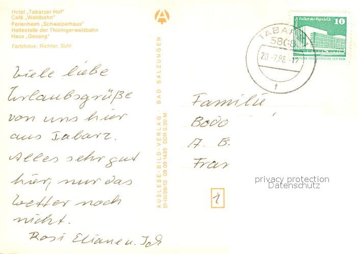 73304579 alte Postkarte Tabarz Hotel Tabarzer Hof Cafe Waldbahn Ferienheim Schweizerhaus Thueringerwaldbahn Haus Gesant postalisch gelaufen Erhaltung siehe scans [FriedD77] KatCode: 11110016067064