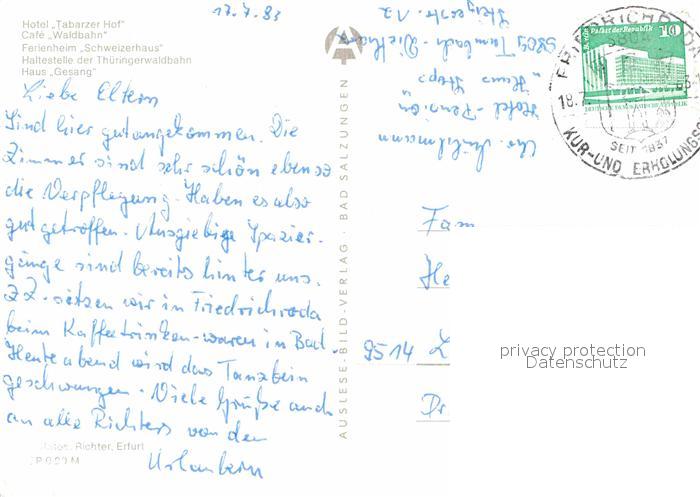 72654970 alte Postkarte Tabarz Hotel-Tabarzer-Hof Cafe-Waldbahn Haus-Gesang postalisch gelaufen Erhaltung siehe scans [LiesaD40] KatCode: 11110016067064