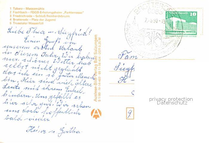 72727351 alte Postkarte Tabarz Rund um den Inselsberg Massemuehle FDGB Erholungsheim Schloss Reinhardsbrunn Platz der Jugend Brotterode Trusetaler Wasserfall postalisch gelaufen Erhaltung siehe scans [FriedD77] KatCode: 11110016067064
