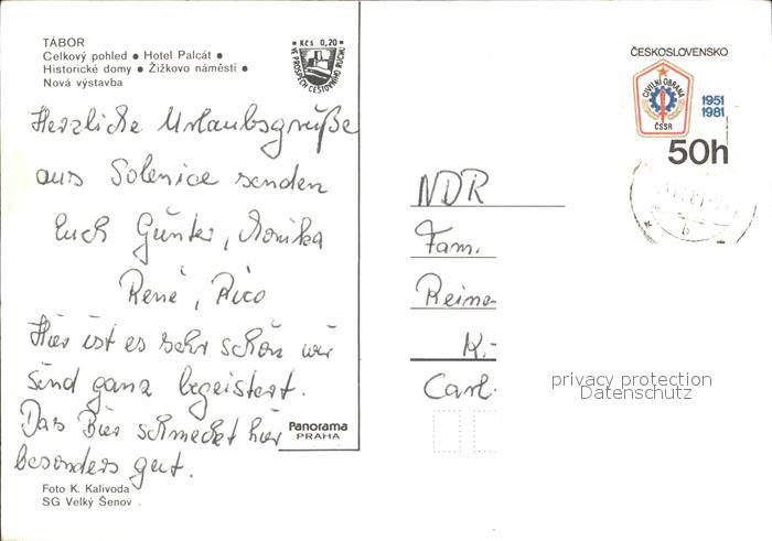 old postcard Tabor Czechia Celkovy pohled Hotel Palcat Historicke domy Zizkovo namesti Nova vystavba postalisch gelaufen Erhaltung siehe scans