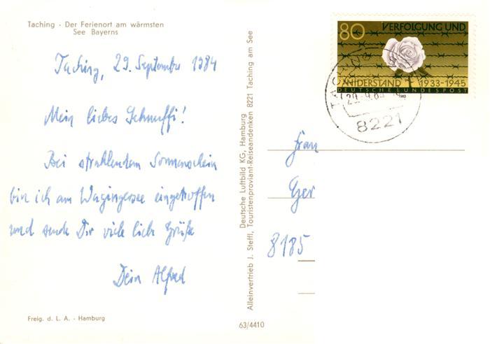 73895270 alte Postkarte Taching See Fliegeraufnahme postalisch gelaufen Erhaltung siehe scans [WerneD78] KatCode: 11110009189150
