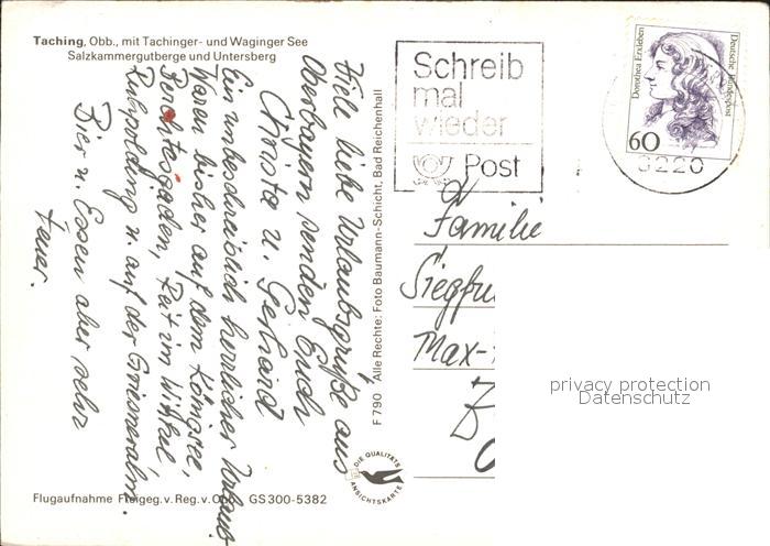 71998718 alte Postkarte Taching See Fliegeraufnahme mit Tachinger und Waginger See postalisch gelaufen Erhaltung siehe scans KatCode: 11110009189150