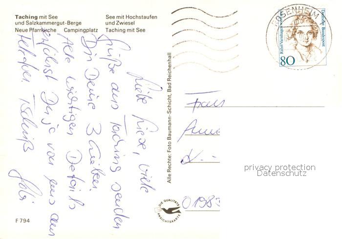 73672854 alte Postkarte Taching See Panorama Neue Pfarrkirche Campingplatz See mit Hochstaufen und Zwiesel Tachingblick postalisch gelaufen Erhaltung siehe scans [WerneD78] KatCode: 11110009189150