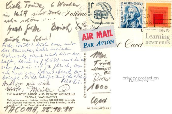 72930717 old postcard Tacoma Narrows Bridge postalisch gelaufen Erhaltung siehe scans [NatalD47] KatCode: 14140500000000