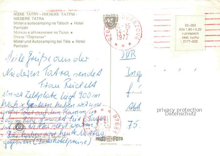 74043637 old postcard Tale Brezno Bries Nizke Tatry SK Motel na Táloch Motel Autocamping Hotel Partizán Badesee postalisch gelaufen Erhaltung siehe scans [FriedD77] KatCode: 11490