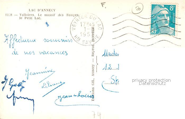 13488896 carte postale Talloires Massif des Bauges Petit Lac vue aérienne postalisch gelaufen Erhaltung siehe scans [FriedD77] KatCode: 11170074174275