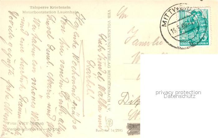 72920176 alte Postkarte Talsperre Kriebstein Bootsstation Lauenhain postalisch gelaufen Erhaltung siehe scans [LiesaD40] KatCode: 11110014375180