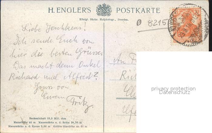 alte Postkarte Talsperre Staudamm Koenig-Friedrich-August Klingenberg Sachsen postalisch gelaufen Erhaltung siehe scans