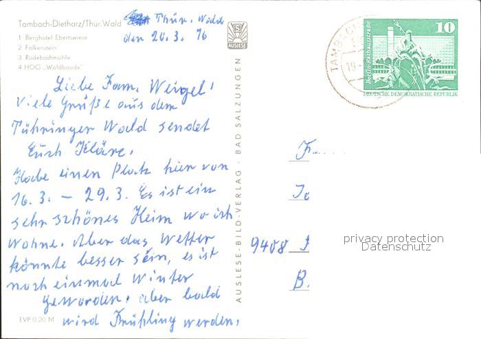 72382757 alte Postkarte Tambach-Dietharz Berghotel Ebertswiese Falkenstein Rodebachmuehle postalisch gelaufen Erhaltung siehe scans KatCode: 11110016067065