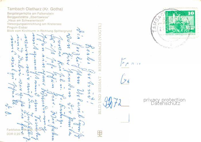72651969 alte Postkarte Tambach-Dietharz Bergsteigerhuette Falkenstein Berggaststaette Ebertswiese Haus am Schwanenteich Haus am Kratersee Pinguin Eisbar Kirchturmblick postalisch gelaufen Erhaltung siehe scans [WerneD78] KatCode: 11110016067065