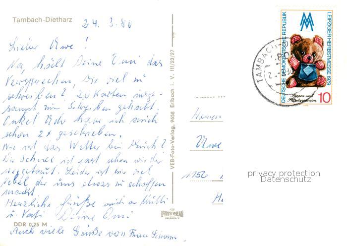 73036521 alte Postkarte Tambach-Dietharz FDGB Erholungsheime 8. Maerz Splittergrund Thueringer Waldbaude postalisch gelaufen Erhaltung siehe scans [KathaD81] KatCode: 11110016067065