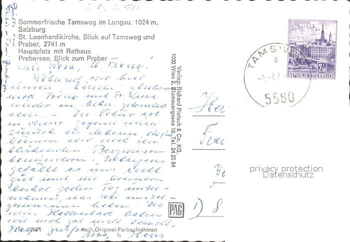 72141240 alte Postkarte Tamsweg Lungau St Leonhardikrche Ortsblick Preber Hauptplatz Rathaus Prebersee postalisch gelaufen Erhaltung siehe scans KatCode: 11390321050510